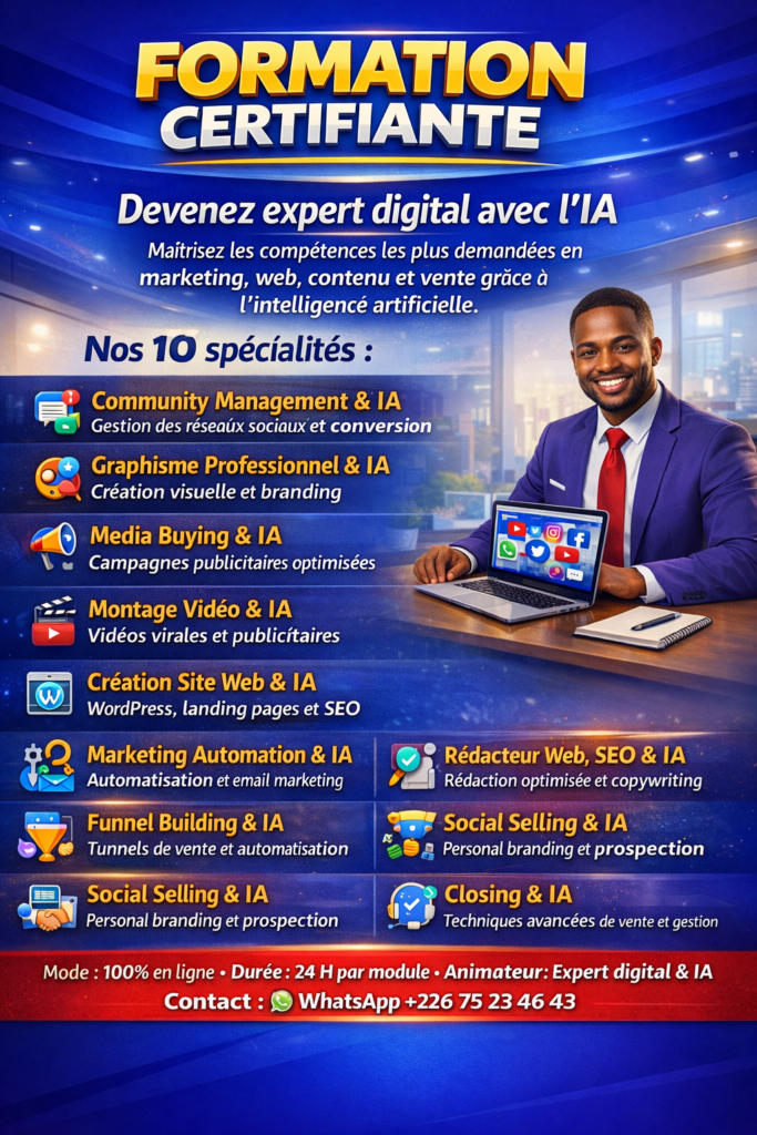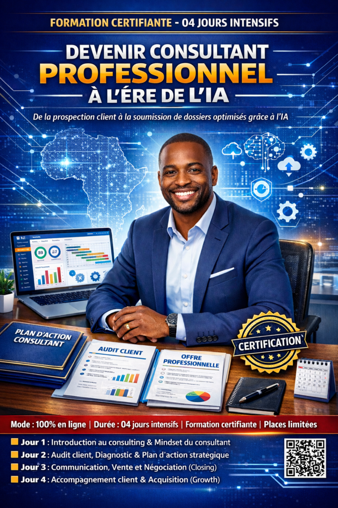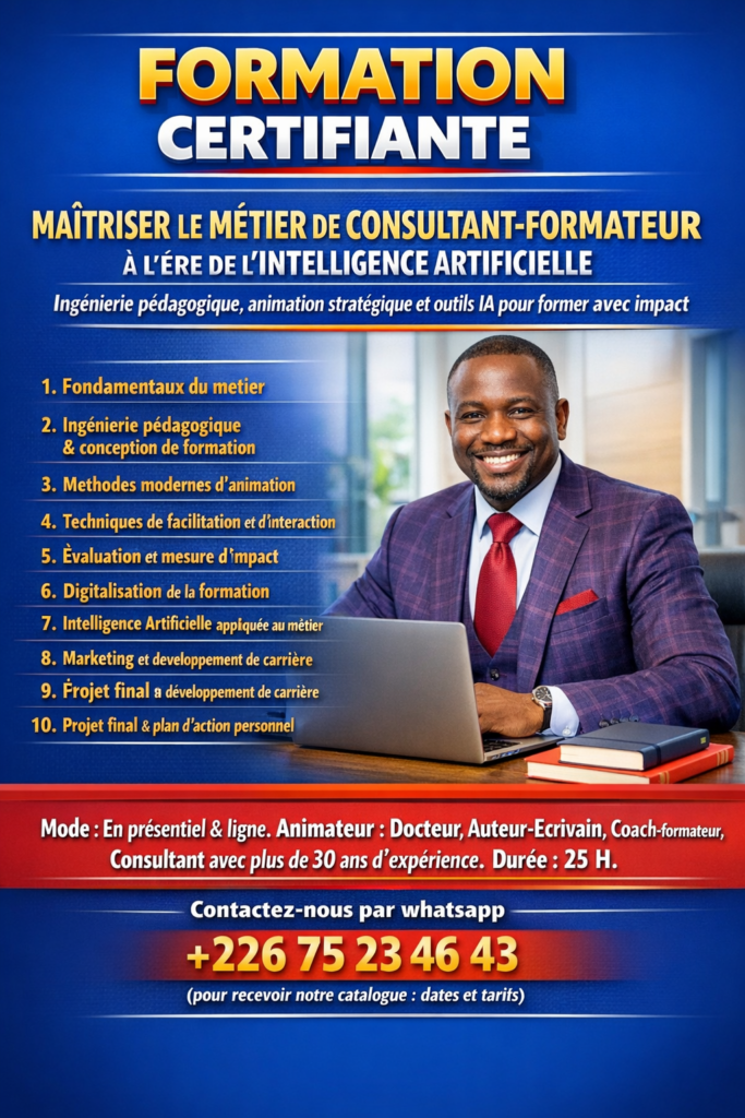 Former des participants capables de devenir des consultants-formateurs professionnels, maîtrisant à la fois l’ingénierie pédagogique, les techniques modernes d’animation, la digitalisation, et l’usage de l’IA (ChatGPT et outils associés) pour concevoir, animer, évaluer et commercialiser des formations avec efficacité.