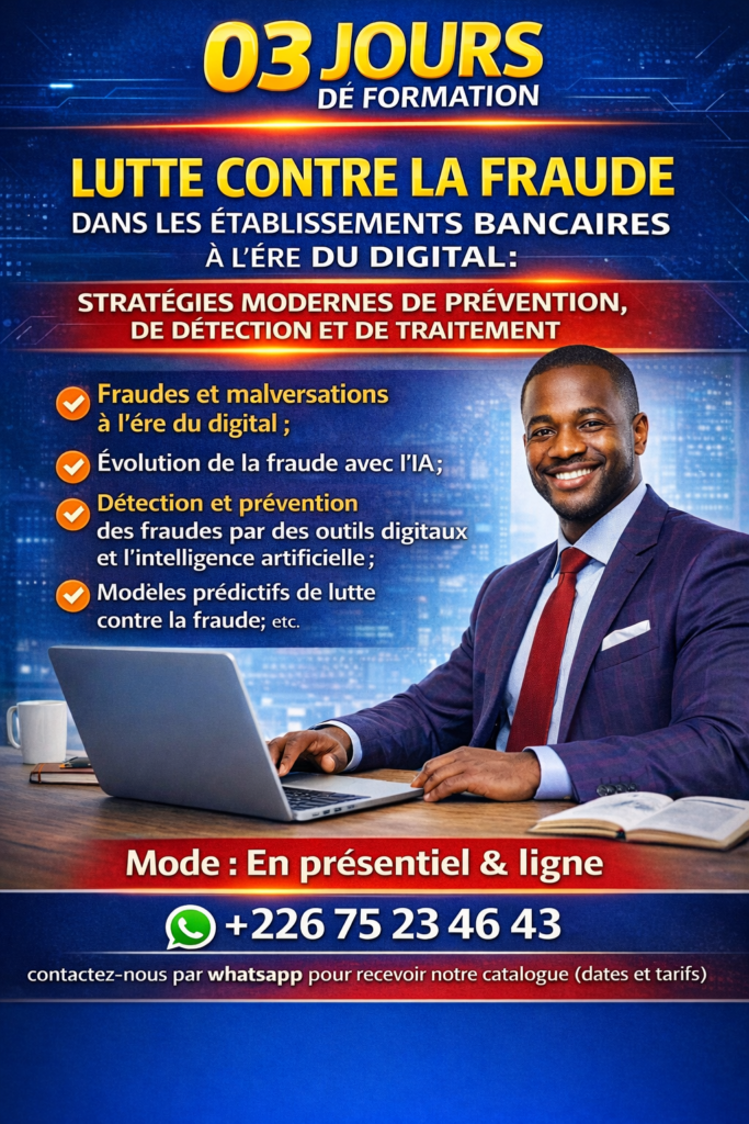 Contenu du programme – Fraudes et malversations à l’ère du digital ; – Évolution de la fraude avec l’IA ; – Détection et prévention des fraudes par des outils digitaux et l’intelligence artificielle ; – Modèles prédictifs de lutte contre la fraude ; etc. 4 études de cas pratiques. Ce séminaire vise à renforcer les capacités des participants en matière d’identification, de prévention, de détection et de traitement des risques de fraude au sein des établissements bancaires et des entreprises, en s’appuyant sur des stratégies modernes et des outils digitaux adaptés aux nouveaux enjeux. |